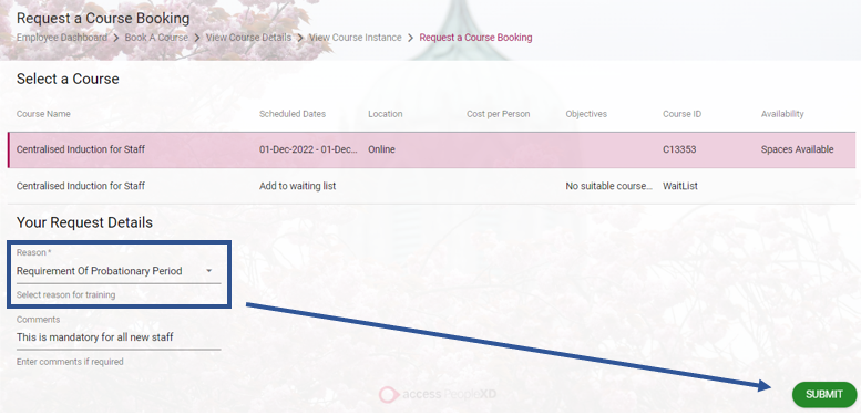 4.  Select your workshop, reason, and feel free to type up a comment before clicking submit.