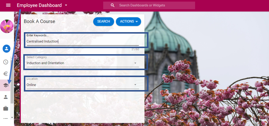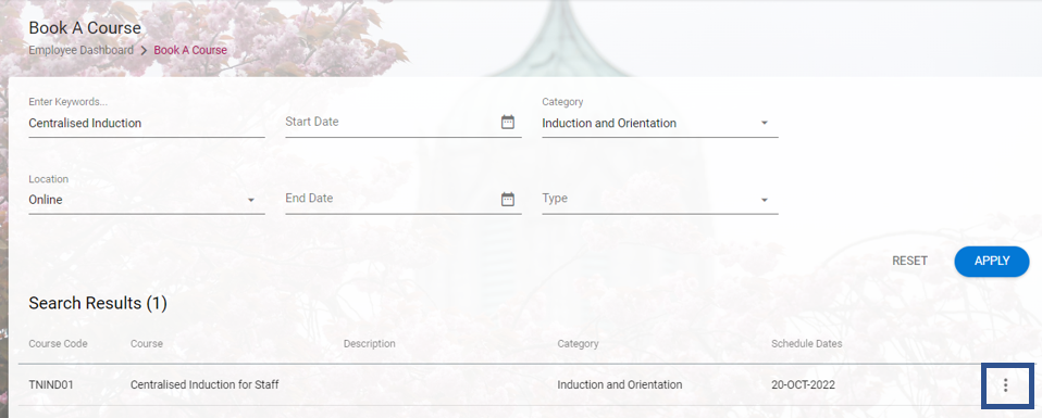3. To register for a particular workshop click the 3 dots below in the blue box and select ‘Request to attend course’ from the drop-down box