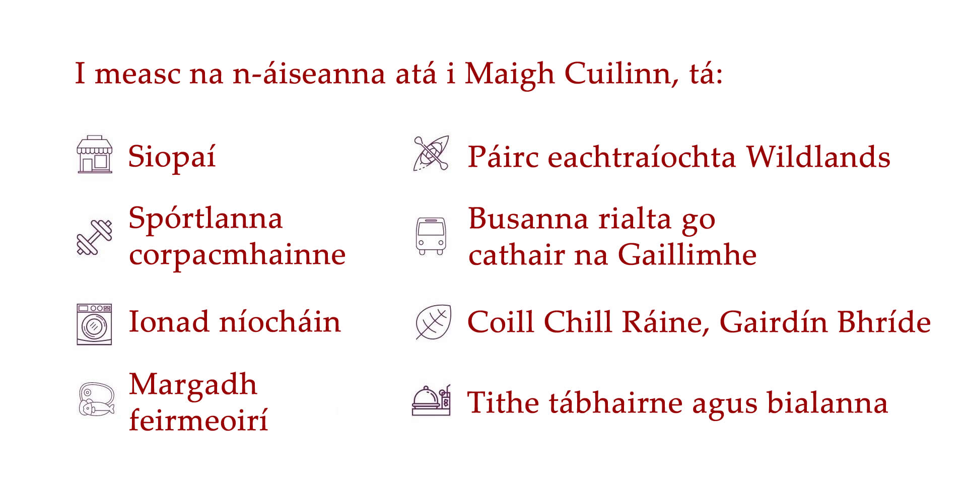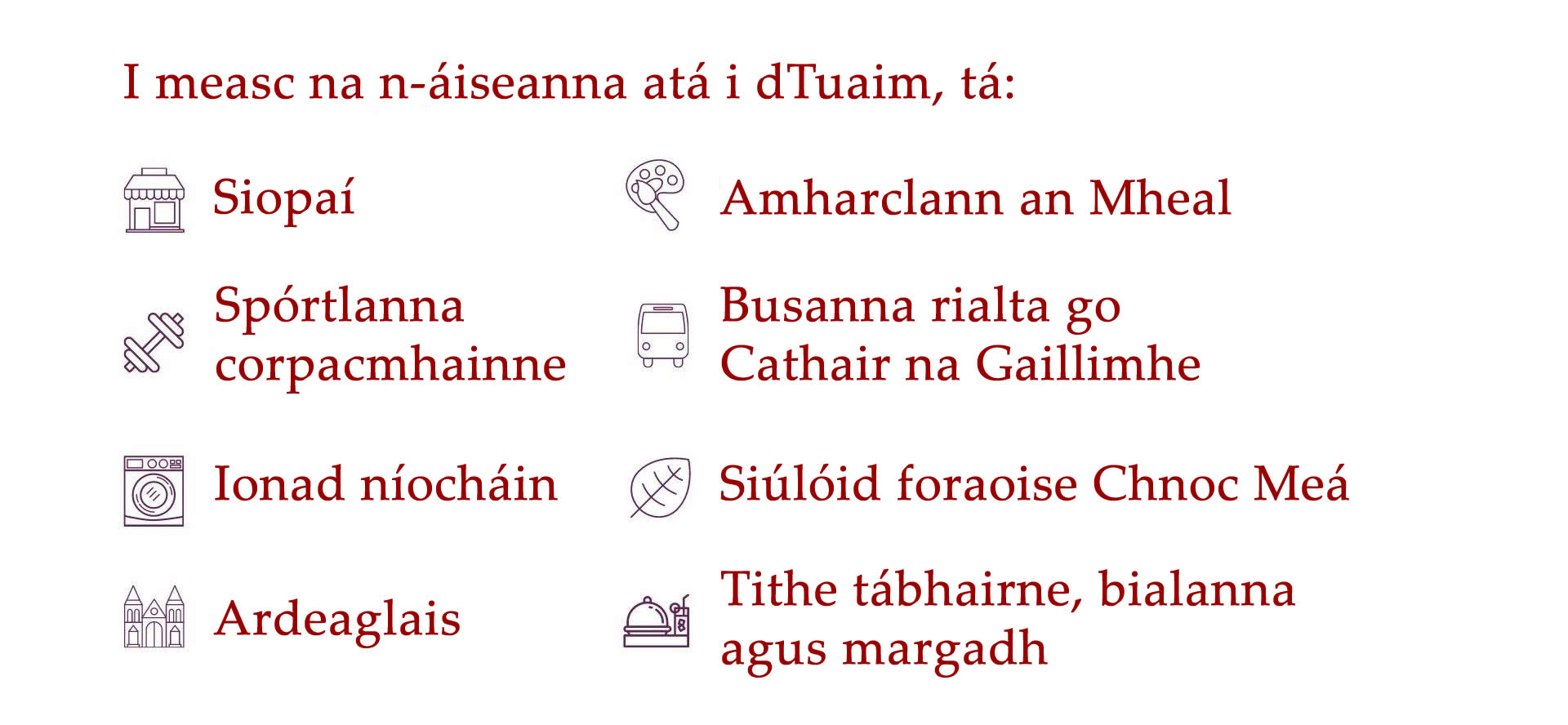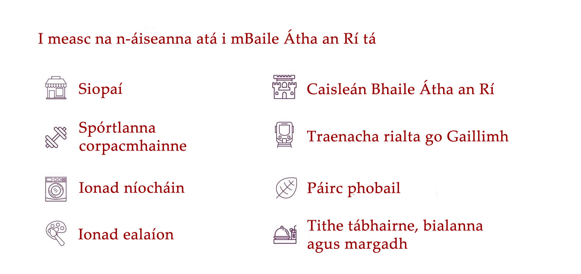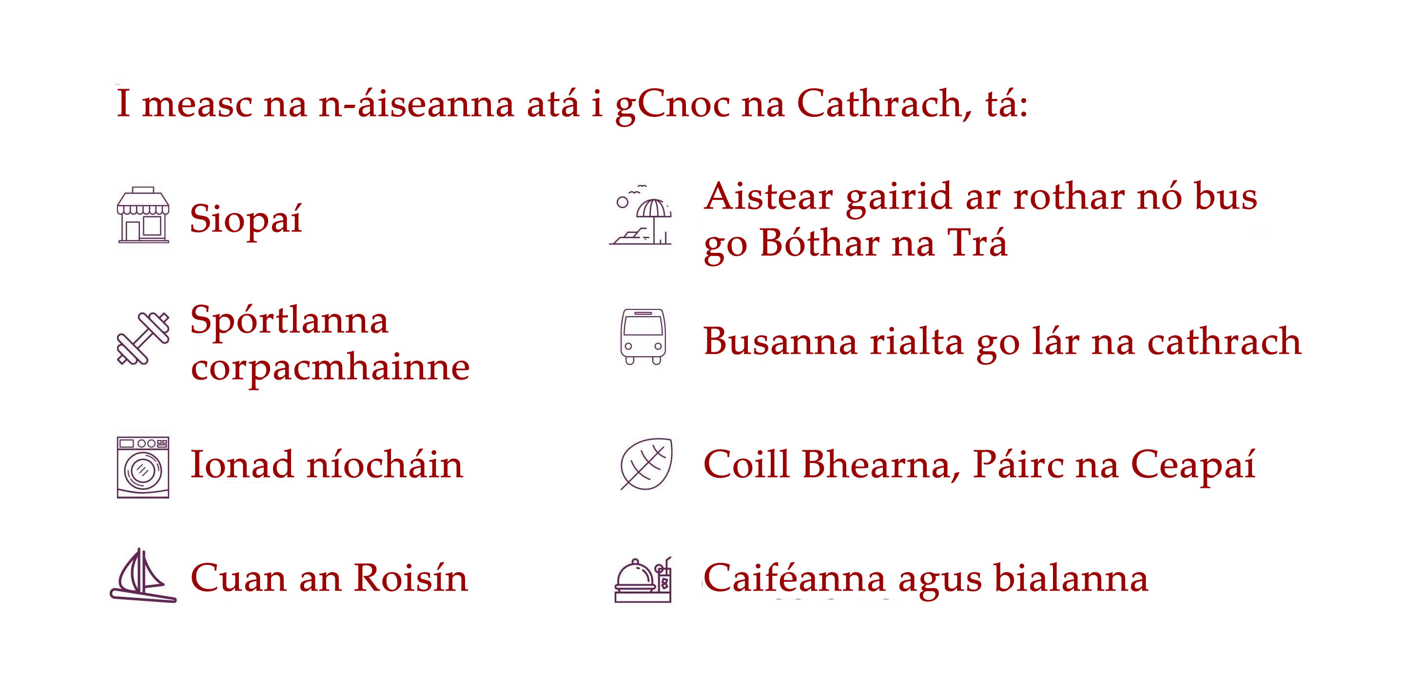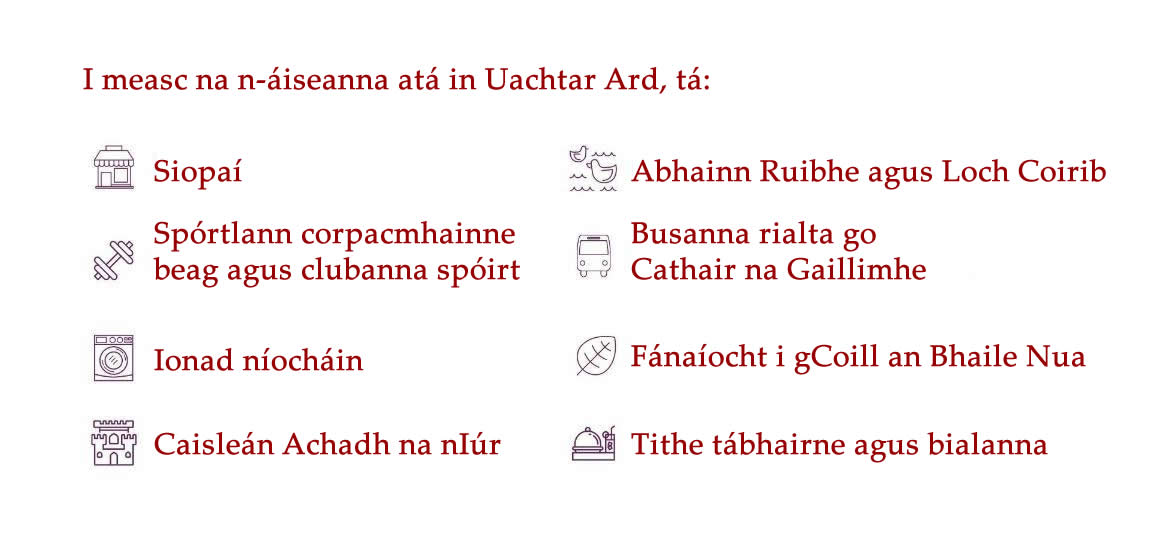 ​Tá níos mó eolais faoi limistéir lóistín na Gaillimhe le fáil thíos.